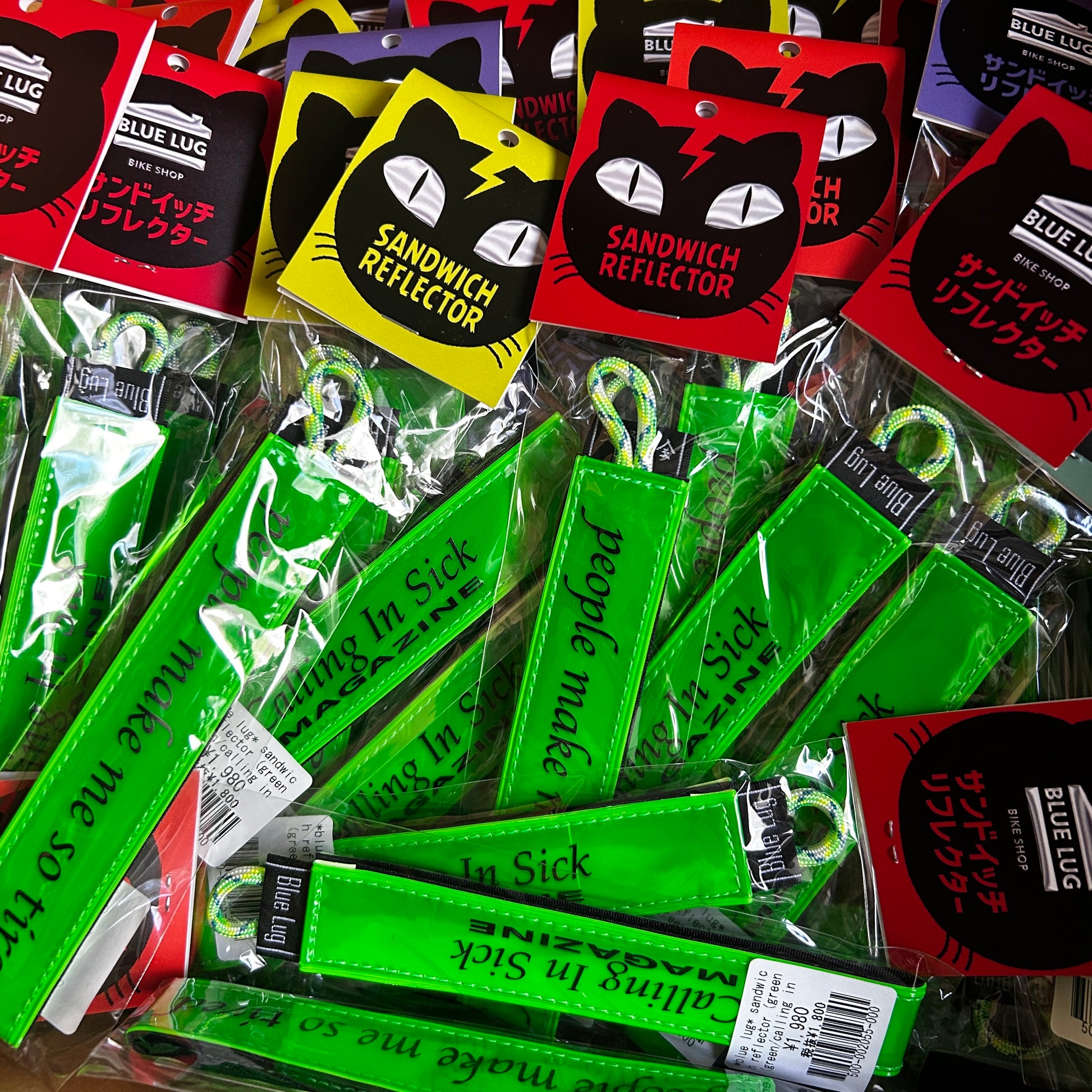 New from Blue Lug. Calling in Sick-branded Sandwich Reflectors! They say "Calling in Sick MAGAZINE" on one side and "people make me so tired" on the other. On a green reflector, of course. In stock and ready to ship.