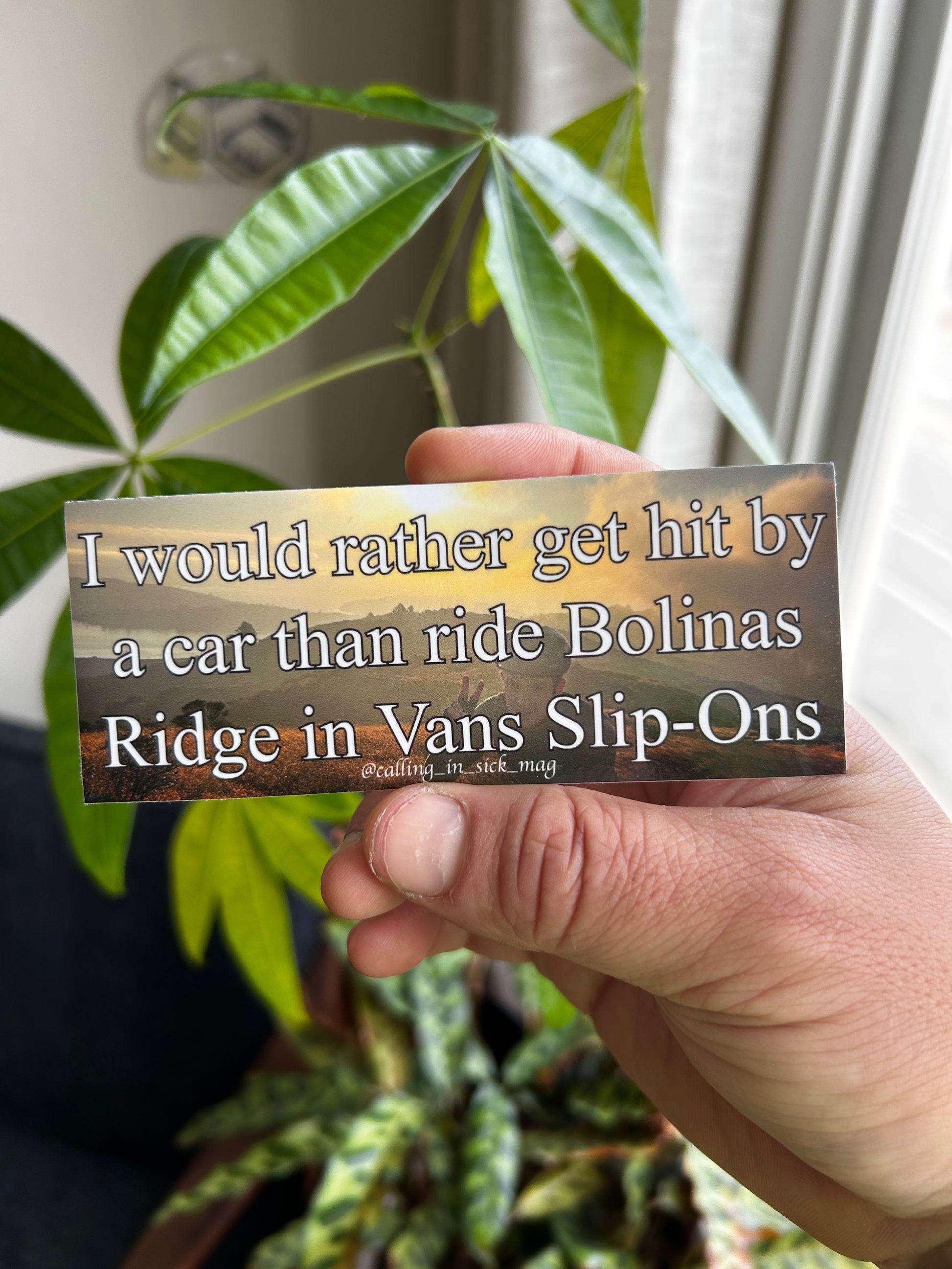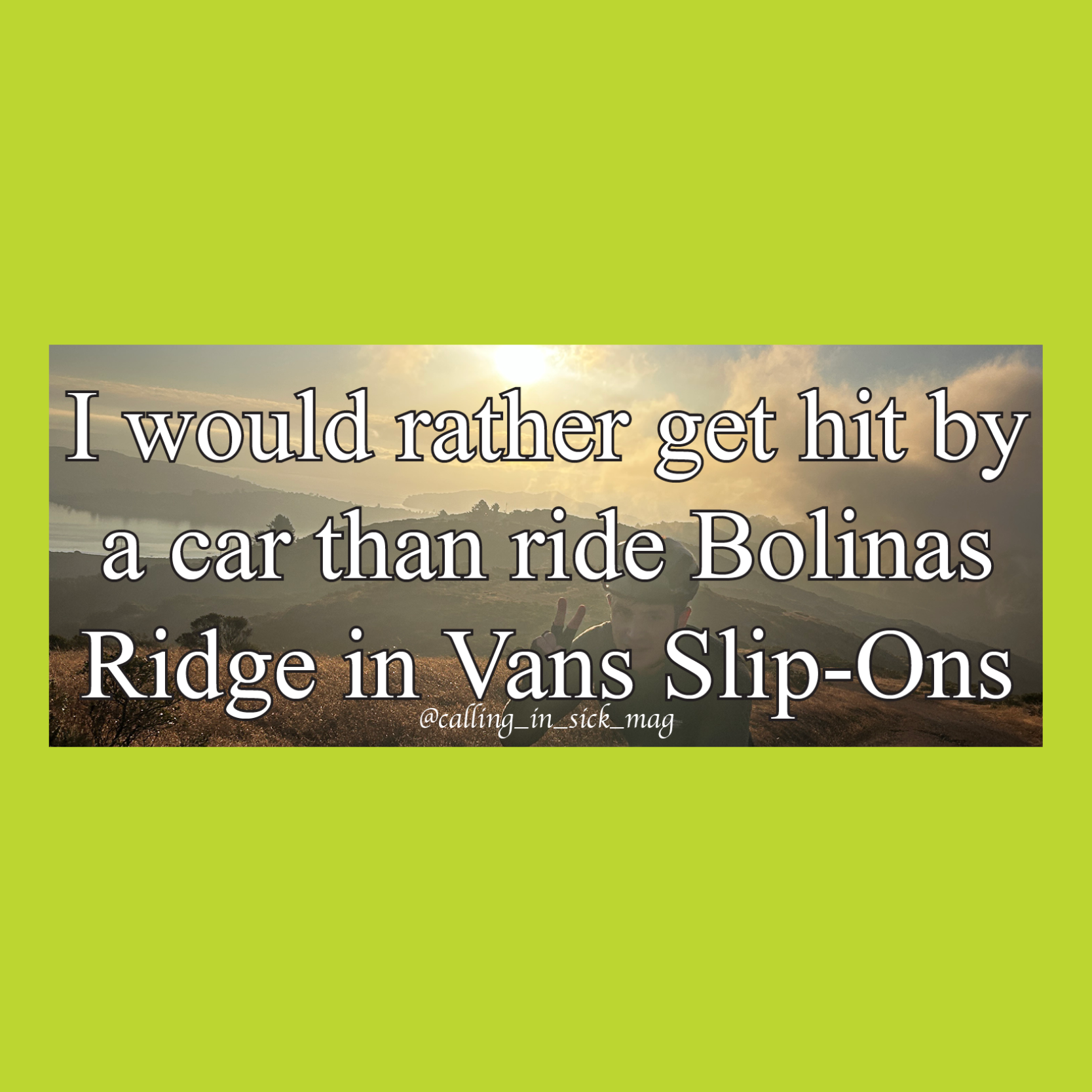 This is something my friend actually said. 5x2" full color sticker featuring said friend in the background picture. Don't take it too seriously. I've ridden Bolinas Ridge in Vans Slip-Ons about fifteen times.