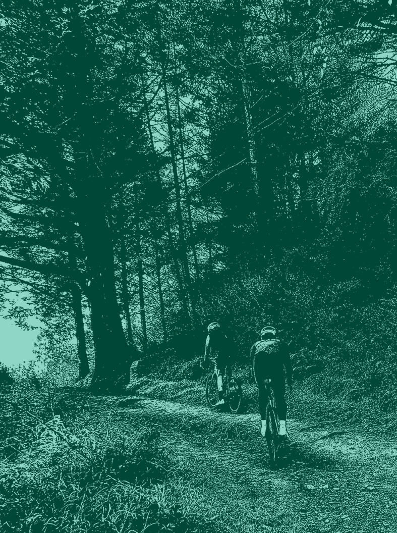 A new shirt design by me, Adam. Pictured are two friends, Luc & Caleb, riding up an undisclosed dirt path on Mt. Tamalpais under a bunch of trees. The image is a sorta monochromatic green-on-green that looks like a black and white photo with a green tint.